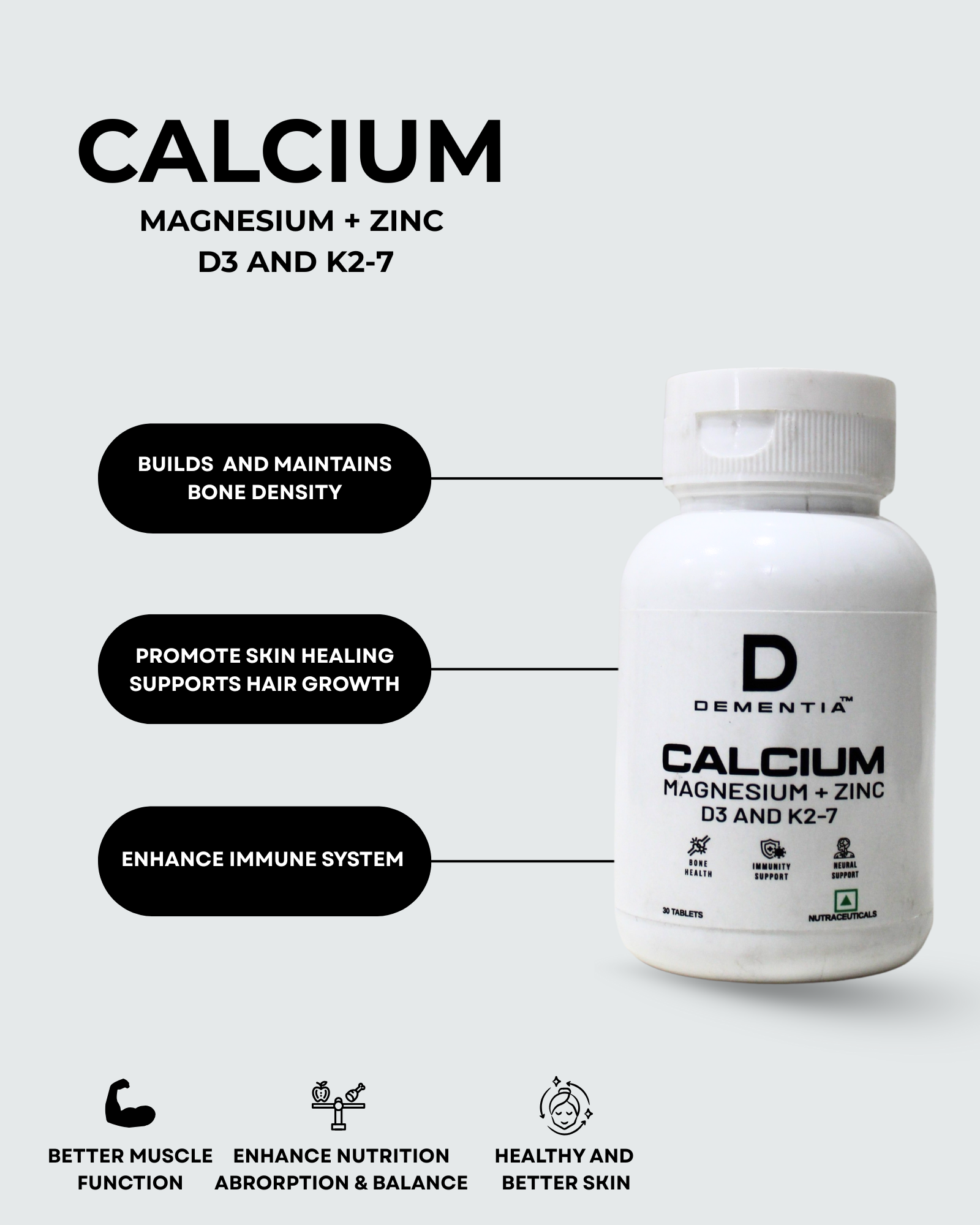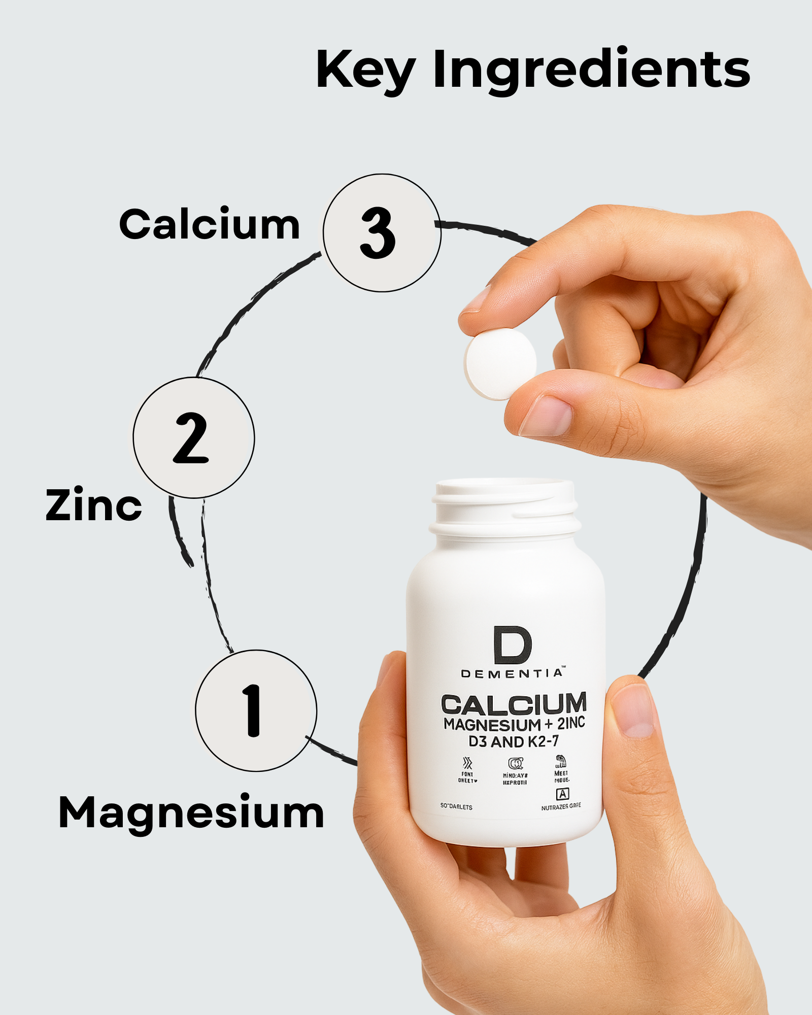 Dementia™ offers a comprehensive bone and overall health supplement, combining essential minerals and vitamins: Calcium, Magnesium, Zinc, Vitamin D3, and Vitamin K2-7.