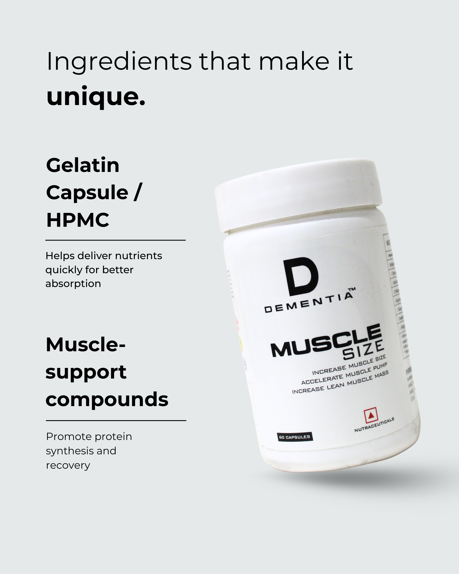 Dementia Muscle Size is designed for those who want to push their limits and build real, noticeable muscle mass. Powered with a fast-absorbing gelatin/HPMC capsule shell, this formula supports muscle recovery, enhances strength, and helps increase lean muscle size. Whether you’re just starting your fitness journey or looking to break plateaus, Muscle Size gives your body the support it needs after intense workouts.