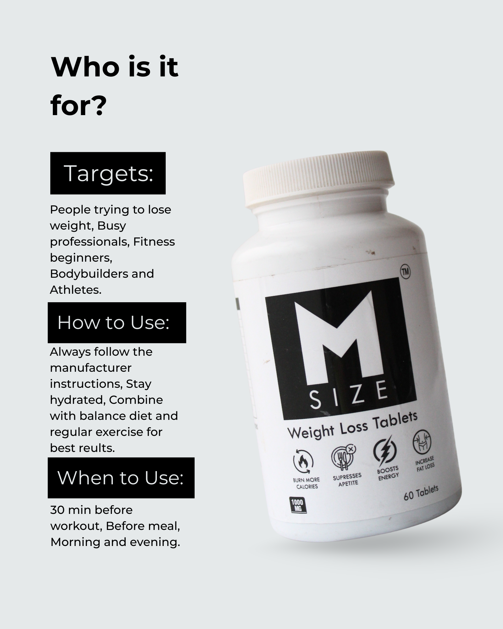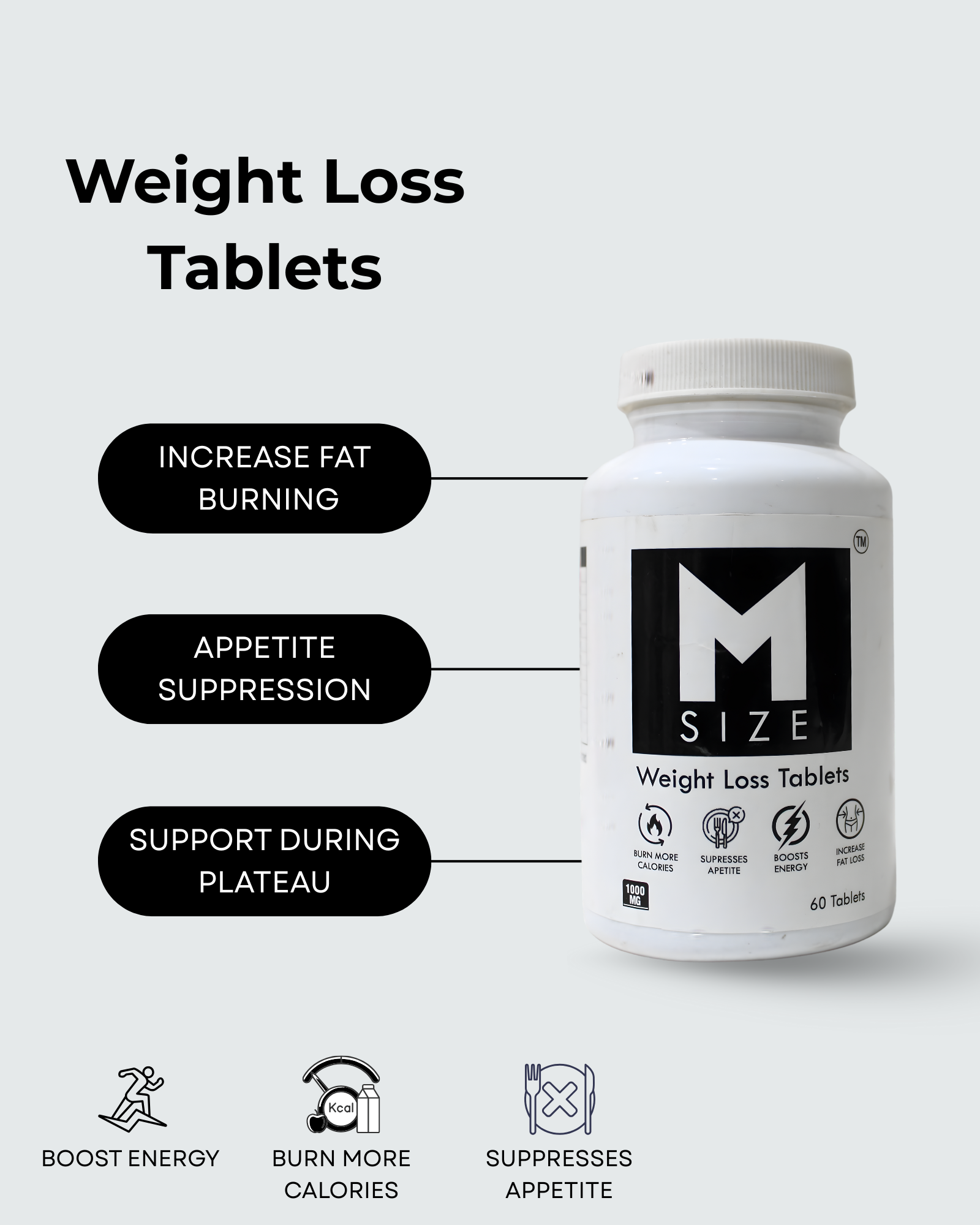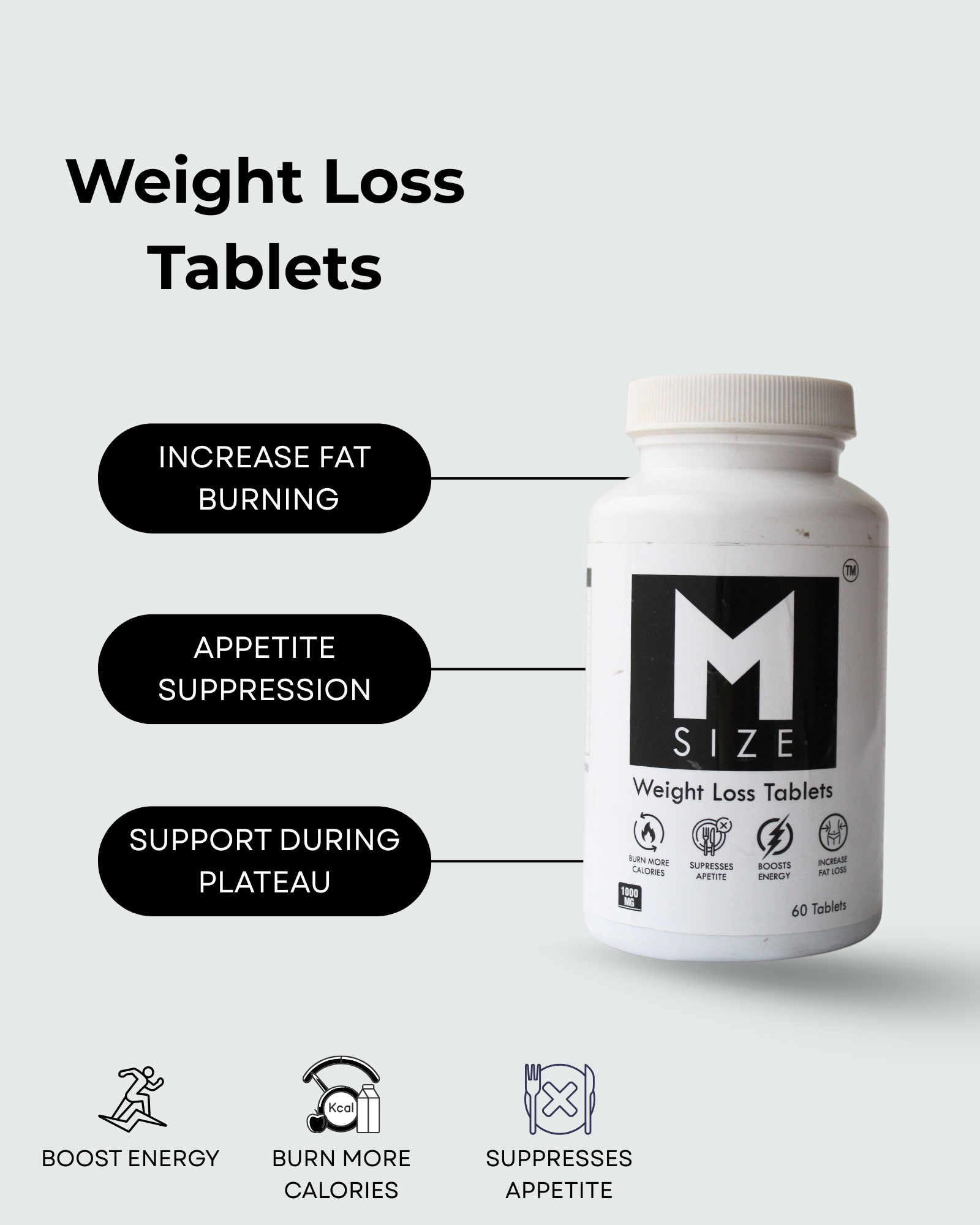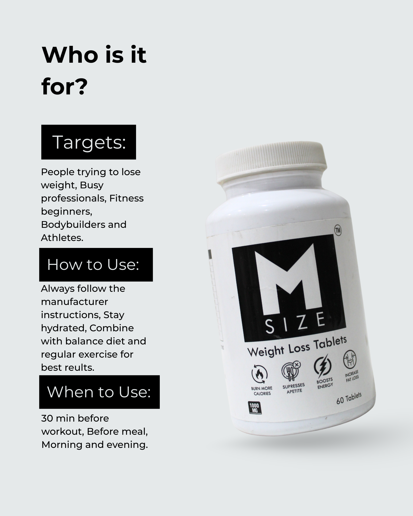 M SIZE™ Weight Loss Tablets are designed to support your weight loss journey through a multi-action approach. These tablets are aimed at helping you overcome plateaus and achieve your goals by targeting fat burning and appetite control.