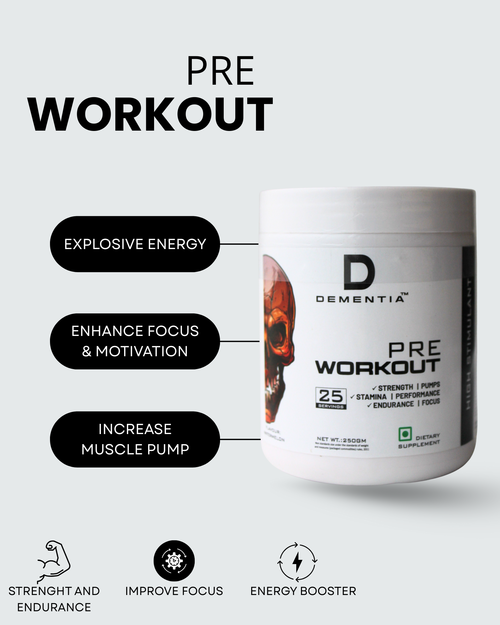 Dementia™ Pre Workout is a dietary supplement designed to maximize training sessions by delivering Explosive Energy and mental focus. It is formulated to enhance performance, strength, and endurance during workouts.