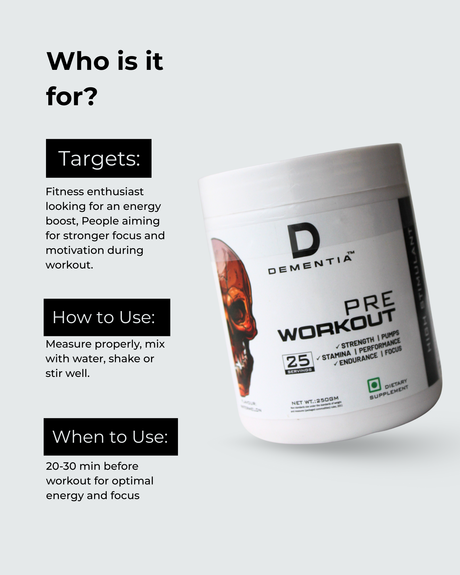 When to Use: Take 20-30 minutes before your workout for optimal energy and focus. The container holds 25 servings (Net Weight 250g).