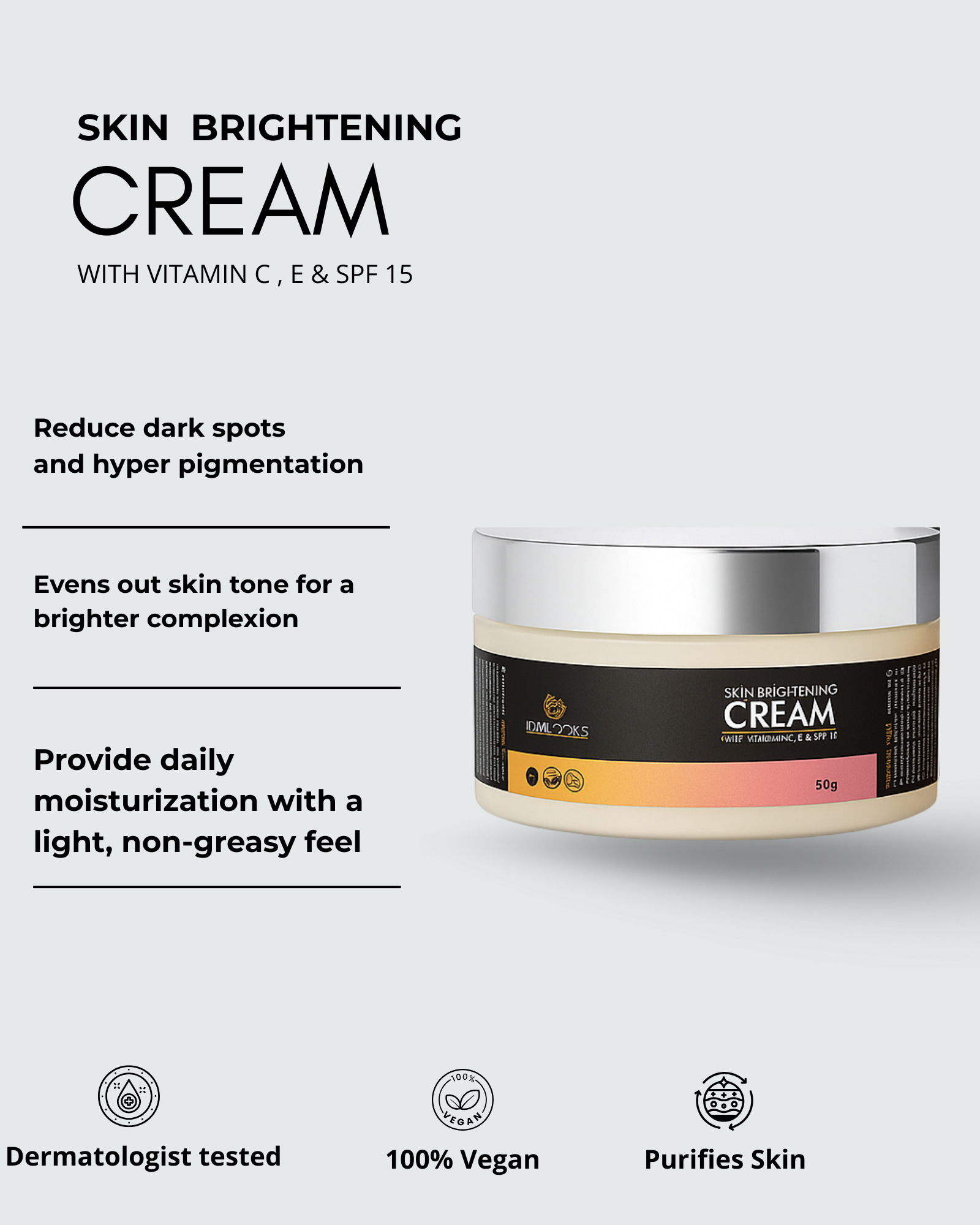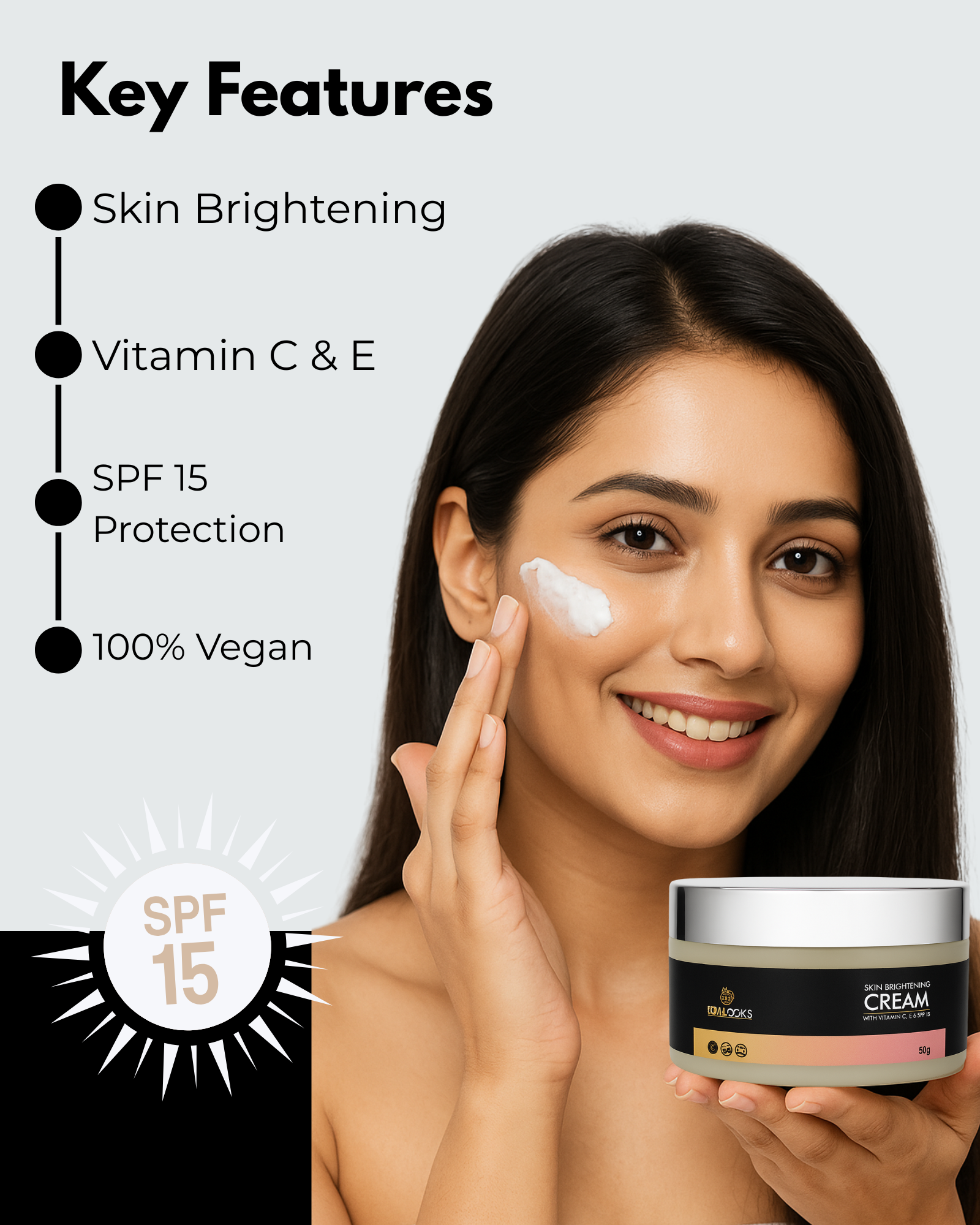 FEMILOOKS Skin Brightening Cream is a 100% Vegan, Dermatologist tested cream formulated to address dark spots, hyperpigmentation, and dullness while providing sun protection. It offers a light, non-greasy daily moisturizer for a brighter, more even complexion.
