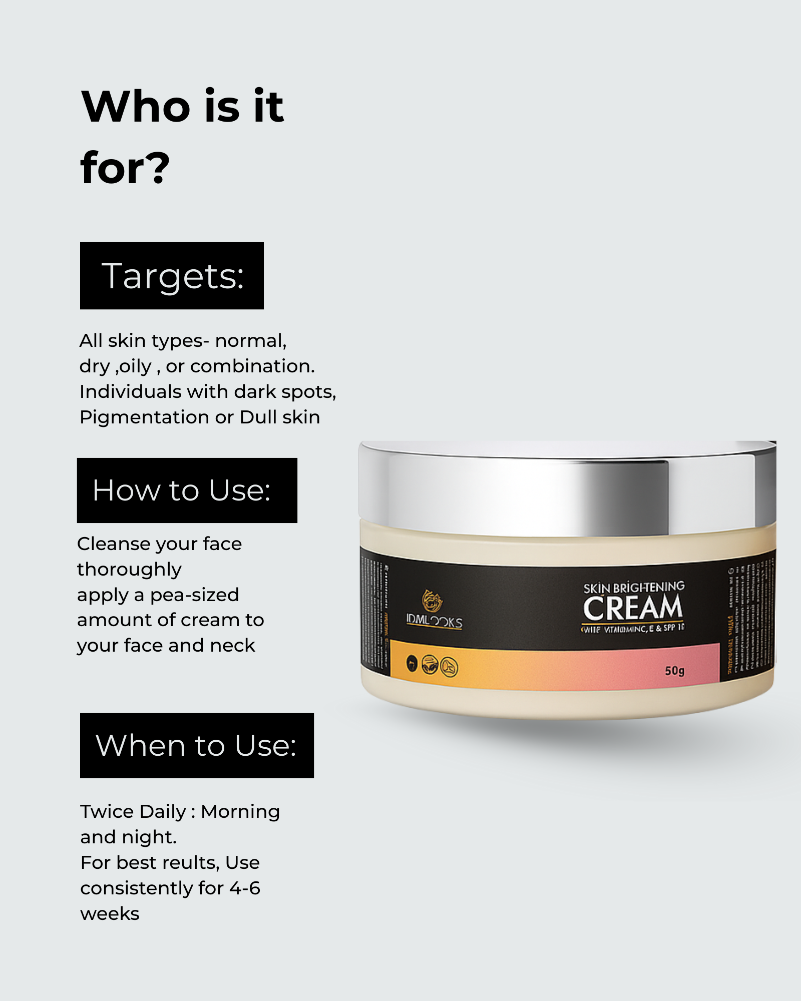 When to Use: Twice Daily: Morning and night. Use consistently for 4-6 weeks for best results.