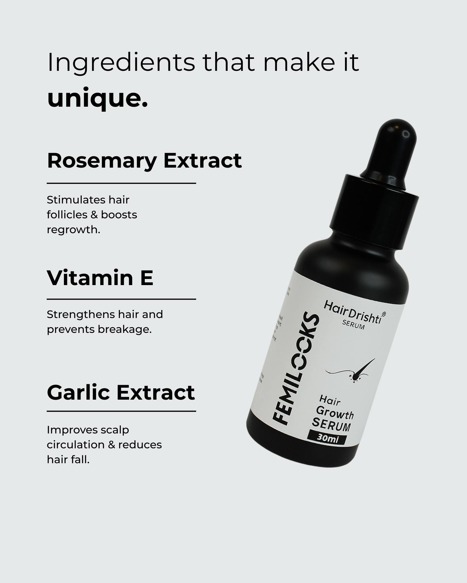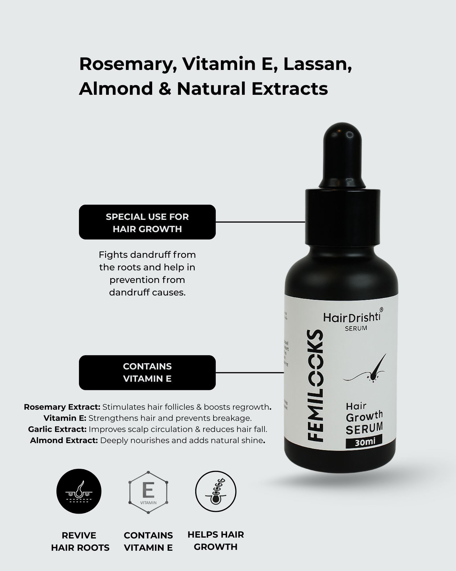 Experience the perfect blend of nature and science with Femilooks Hair Serum, specially formulated to reduce hair fall, boost growth, and restore natural shine. Enriched with Rosemary Extract, Vitamin E, Lassan Extract, Almond Extract, Coconut Extract, Karanj Oil, Black Seed Extract, and Aloe Vera, this lightweight serum deeply nourishes the scalp, strengthens roots, and promotes healthier, thicker hair.